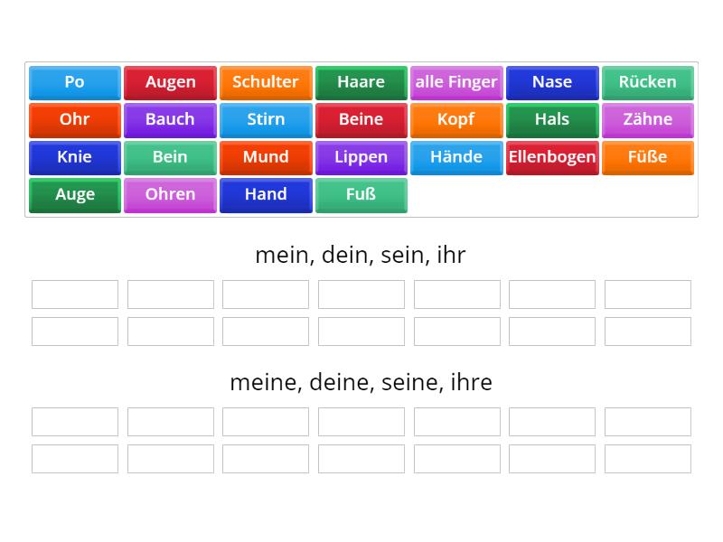mein, dein, sein, ihr: Kopf, Bauch, Rücken , Fuß , Mund , Ohr, Hals , Auge, Bein, Knie, Po, meine, deine, seine, ihre: Haare, Nase, Hand , Füße, Hände, Ohren, Augen, Beine, alle Finger, Zähne, Stirn, Lippen, Schulter, Ellenbogen,